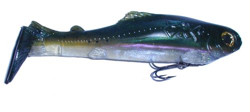 Overview/History:  The 3:16 K-9 was released in November of 2003.  This softbait is available in 7” and 8.5” and comes in two colors, a green trout and a brown trout.  The 7” K-9 comes stock with a  1/0 VMC hook and weighs 2.75oz.  The 8.5” is equipped with a 2/0 Owner Stinger treble and weighs in at 4.40oz.  Both baits sink slowly and run naturally in the slightly sub-surface to 10 foot depth range. The 7” retails for approximately $18 and the 8.5” for $20.