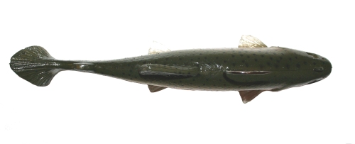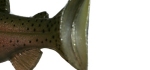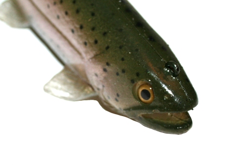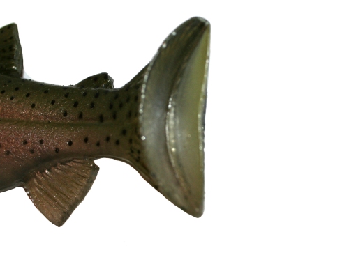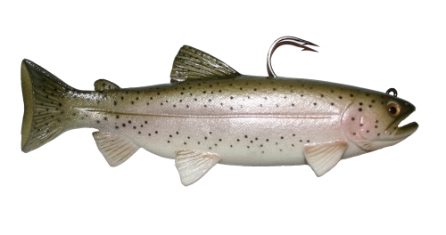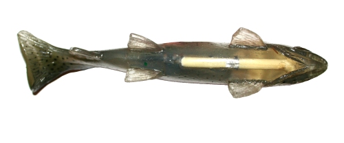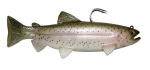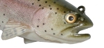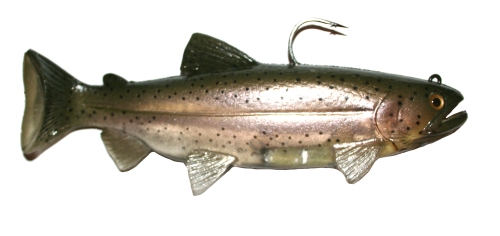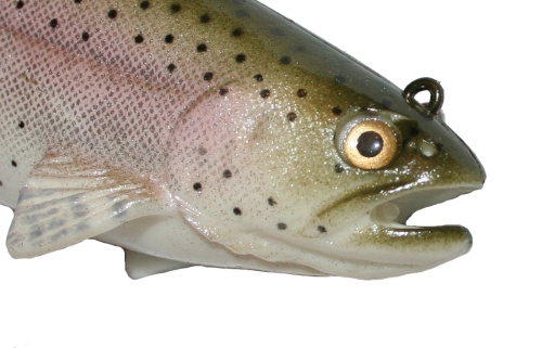 The production lures that came out months later were similar, but different in some important regards.  The production lures, like you see photographed here in this review, were OEM’d through Castaic Softbait and painted, not poured to get the color.  They had less weight in them, and were made from an injection type plastic.  The lures measure 8" and came in two sink rates, a heavy (denoted by red dot on belly) and medium denoted by a green dot.  There were several trout patterns available including the Castaic ghost rainbow pattern.