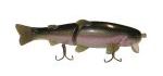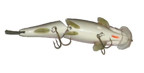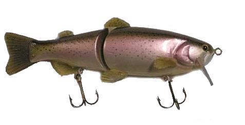 This is a super realistic / attention to detail type bait that breathes quality from the minute you pick it up. The paint jobs are attractive, consistent and durable. I got a few vertical cracks in the paint on my bait, but that was only after 4 years of sitting baking in my tackle box. This is one of the few hardbaits out there that don't really require any additional coating to maintain the paint job. The screw eyes appear to be brass and the hinges are rock solid. The bills are thick and securely mounted. I've bounced my bait off the rocks a few times (cringe!) and it's come back ok every time. I've been fishing my bait for 7 years now and it is every bit as fishable as the day I bought it. For some reason the smaller fish seem to stay away from this bait but the big ones will woof it every so often. Of the 4 or 5 bites I've had on the Castaic Hardbait, my best two fish went 13.8 and 15.4lbs and that frankly is all the evidence I need to tell me this lure is the real deal. From a collector's standpoint, this is a highly desireable lure. The original wooden Castaics routinely go for over $300 on Ebay and the Polyesterne versions are not far behind. Whether you're looking for a bait to fish with or to put on the mantle piece, this is a great lure. The main problem I had with this bait was that the fins dried out and cracked over time. It wouldn't be a problem except that you can't get replacement Castaic Hardbait fins any more since the baits are no longer in production. What I did with mine was shave down a 12" MS Slammer tail and glued it in as a replacement. With the 12" Slammer tail at it's full length, you get a very subtle but lively action out of the tail. It's not a perfect solution because shaving the tails down like that makes them weak and flimpsy but I actually think it's better than the stock tail because of the additional action. It's something to try if you have one and want to stick pigs on it rather than leave it on the mantle piece! The Castaic Hardbait Trout is no longer in production The best place to look for one would be on eBay. Special thanks to Henry Shorr for providing the pictures of the original wooden bait