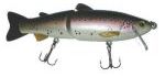 The Castaic Hardbait Trout was the first commercially available super-realistic trout bait, and to this day you could argue that it is still the most realistic hardbait trout there is. Ken Huddleston and Chomp Josephite first started making these baits in the Spring of 1993, mainly for striper fisherman who were interested in using them at Pyramid Lake. A year later the baits were sold at the Fred Hall Show in Long Beach. These original baits (first row above) were made from wood and have a fat overall profile. Most of the wood baits that I have seen are a light trout pattern with white or pink sides, although like any hand crafted bait, they probably had quite a few color variations. The second generation of these baits (second row above) came out around the Spring of 1997 and were made from polyestrene by Chomp and Ray Diaz. These baits have a narrower overall profile and were available in four colors (Rainbow Trout, Brook Trout, Silver, and Gold). The silver and gold patterns were less common and are highly desirable now as collector items. Both baits are floaters however the polyestrene baits are not super buoyant and naturally dive down to 6 or 8 feet on the retrieve. I have not seen the wood bait in the water, but the composite has a very subtle narrow kick to it.